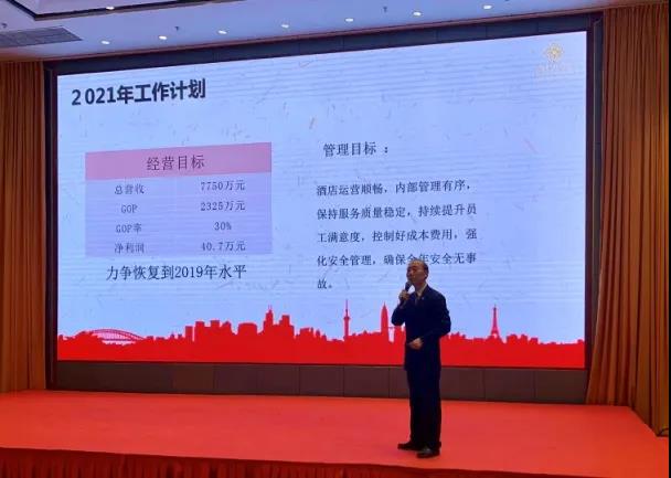 在對(duì)2020年度工作全面總結(jié)中,酒店經(jīng)營班子肯定了全體員工在過去一年的辛勤付出和取得的經(jīng)營成效,并對(duì)2021年度工作目標(biāo)進(jìn)行了部署和動(dòng)員。