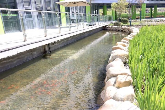 ——教學樓周邊利用雨水回收系統(tǒng),建有下凹式綠地和景觀魚池,既實現了循環(huán)利用雨水的環(huán)保功能,更是孩子們課間休息玩耍、做科學實踐活動的好去處。