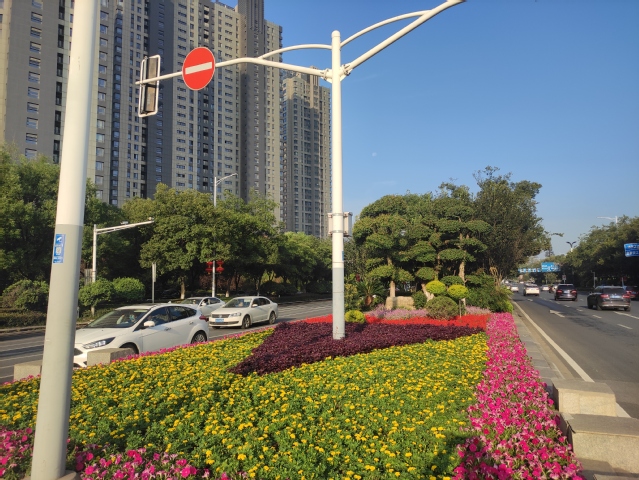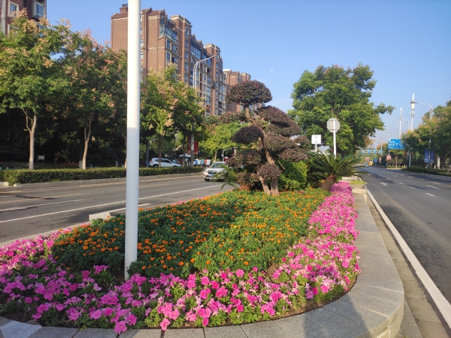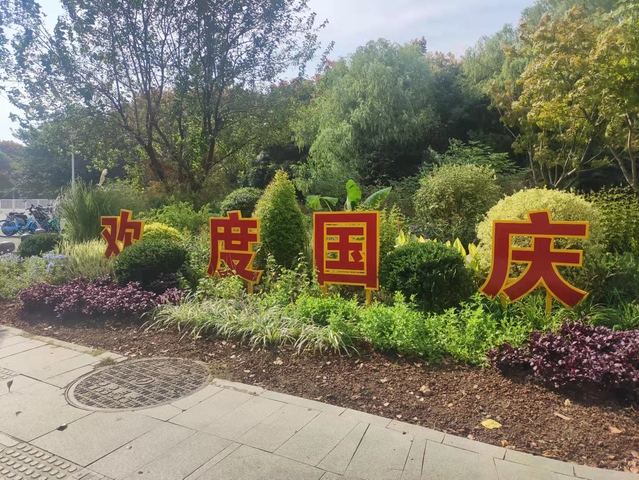 樂山路夢(mèng)都大街東南角節(jié)點(diǎn)是新增加的花境景觀,使用了完美冬青、迷迭香、金葉蕕等二十多個(gè)草花品種,錯(cuò)落有致的草花搭配和花境中豎起的歡度國(guó)慶標(biāo)語,烘托出熱烈的節(jié)日氣氛。