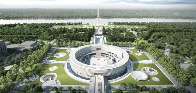 項目建設范圍總面積約為62000 平方米。建設內(nèi)容包含憲法展廳及宣誓廣場、法之谷城市綠坡及配套設施、場地東西兩側(cè)的人行天橋、場地東側(cè)的公園主入口廣場等(場地北側(cè)的濕地公園維持現(xiàn)狀,不做開發(fā))。容積率 0.09,建筑密度 9%,綠地率 36.8%。本項目總建筑面積為 29896 平方米,其中地上建筑面積 5584 平方米,地下建筑面積24312 平方米,建筑高度 16.5米,地上 2 層(首層架空),地下 1 層。功能包含展覽及地下車庫等。