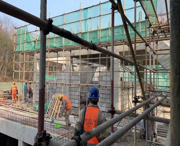 在紫金山莊配套設(shè)施擴(kuò)改建項(xiàng)目現(xiàn)場(chǎng),聽到的是機(jī)器轟鳴、車輛喧囂的聲音,看到的是工作忙碌、干勁十足的景象,工人們正加緊二次結(jié)構(gòu)的施工。