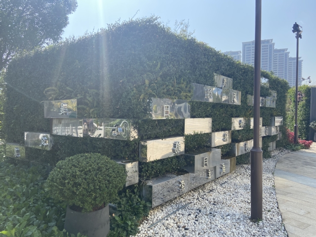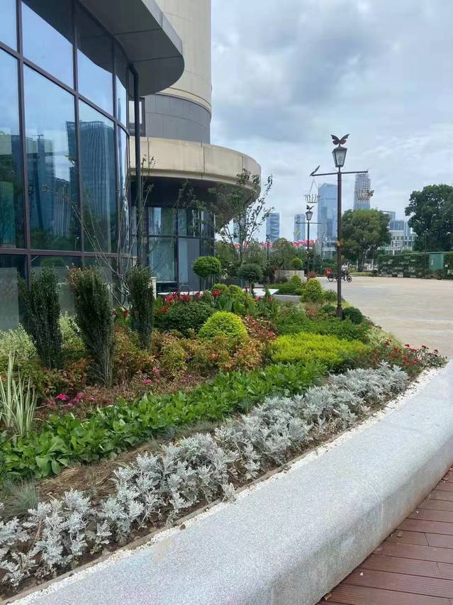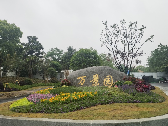 萬(wàn)景園北入口項(xiàng)目原始花壇改造成弧形整石花壇,常夏石竹、八仙花、女貞球等彩葉花灌木鋪滿在景觀石的四周,形成植物品種豐富、層次分明小型花境。入口處設(shè)標(biāo)有“萬(wàn)景園”字樣高達(dá)12米的立牌,高大醒目,與魚(yú)嘴公園、青年文化公園、綠博園形成了統(tǒng)一的濱江風(fēng)光帶入口標(biāo)識(shí)。