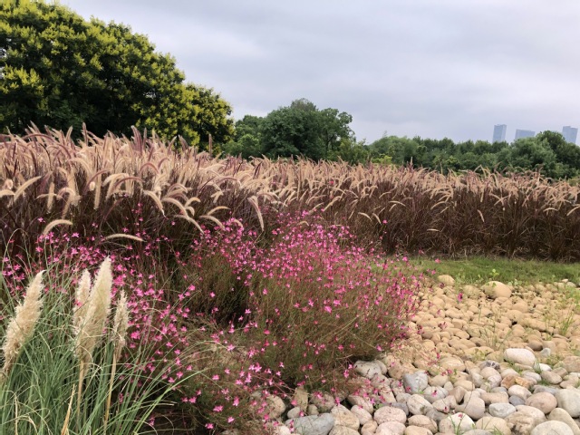 紫金文創(chuàng)園屋頂花園提升項(xiàng)目將植物配置進(jìn)行全面提檔升級(jí),原有枯黃退化高低不平的狗牙根草地進(jìn)行翻新整地,栽植薄雪萬(wàn)年草,紅葉景天,粉黛亂子草、紫穗狼尾草等灌木和草本植物,既保證了屋頂承重的要求,又形成了野趣的屋頂景觀效果。