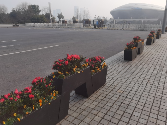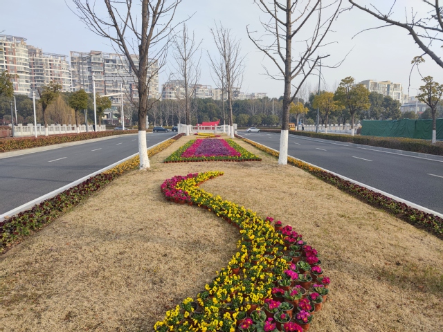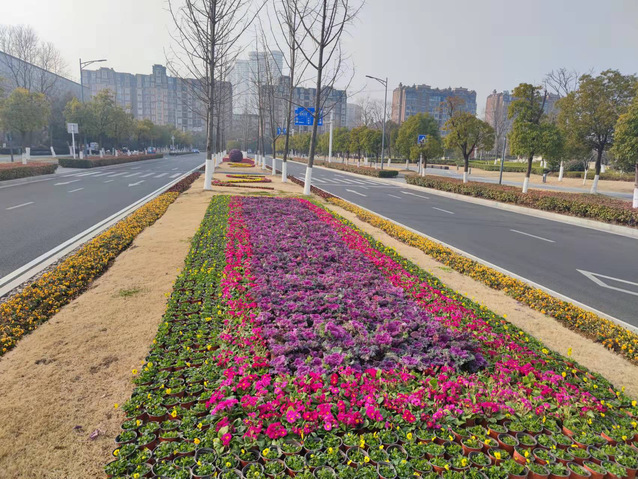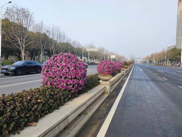 江蘇大劇院水韻路中分帶的花球也換上了新裝。10個巨大的羽衣甘藍花球被粉色的報春花和紅黃顏色角堇組成的花帶簇擁著,與兩邊的直線橙色花邊、方形花卉矩陣、流線型花帶一起構成了一幅色彩斑斕、氣勢恢宏的絢麗畫卷,不但為兩會烘托出莊嚴隆重的氛圍,也洋溢著春節(jié)喜慶的氣氛。