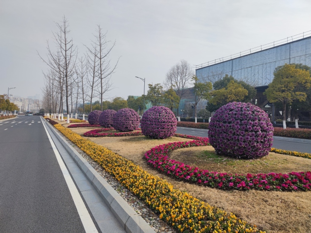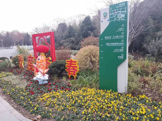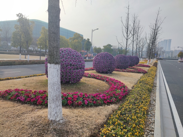 南京奧體中心北門夢都大街人行道旁新增設一組 歡度新春花境式小品生態(tài)微景觀,深紫色羽衣甘藍黃色三色堇植物的搭配,簡潔明了,鯉魚躍龍門”小品和歡度新春字樣的組合營造出濃濃的年味。道路中分帶的花球換上了“新裝”,4個巨大的羽衣甘藍花球在太陽下盡情地綻放著,烘托出了冬奧會的隆重氣氛,寓意在歡度新春佳節(jié)之際,祝愿冬奧會的奧運健兒們能夠魚躍龍門創(chuàng)佳績。