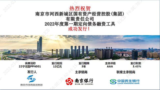 本次債項(xiàng)發(fā)行在主承銷商南京銀行,聯(lián)席承銷商中國(guó)民生銀行的共同努力下成功首發(fā)12億元(債券簡(jiǎn)稱:22寧河西PPN001)。