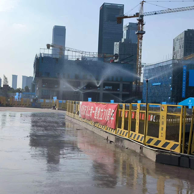 該項目A、B、C區(qū)目前處于底板施工階段,針對揚(yáng)塵管控,新城公司項目管理團(tuán)隊嚴(yán)格按照“十達(dá)標(biāo)”管理標(biāo)準(zhǔn)進(jìn)行施工,在出入口規(guī)范設(shè)置沖洗平臺,并配合高壓水槍等設(shè)備對進(jìn)出車輛進(jìn)行全方位沖洗,杜絕了車輛帶泥上路。施工現(xiàn)場配備霧炮機(jī)、高桿噴淋進(jìn)行360°旋轉(zhuǎn)降塵。同時,項目安排專人對施工道路進(jìn)行清掃,灑水車不間斷灑水使道路保持濕潤,進(jìn)一步提升工地抑塵效果。